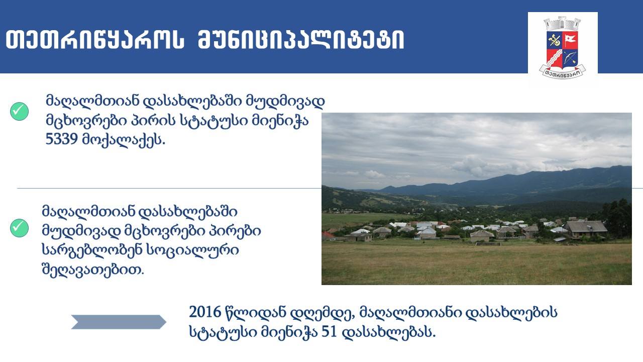 "მაღალმთიანი რეგიონების განვითარების შესახებ" საქართველოს კანონის ამოქმედებიდან დღემდე, თეთრიწყაროს მუნიციპალიტეტში მაღალმთიან დასახლებაში მუდმივად მცხოვრები პირის სტატუსი მიენიჭა 5339 მოქალაქეს.